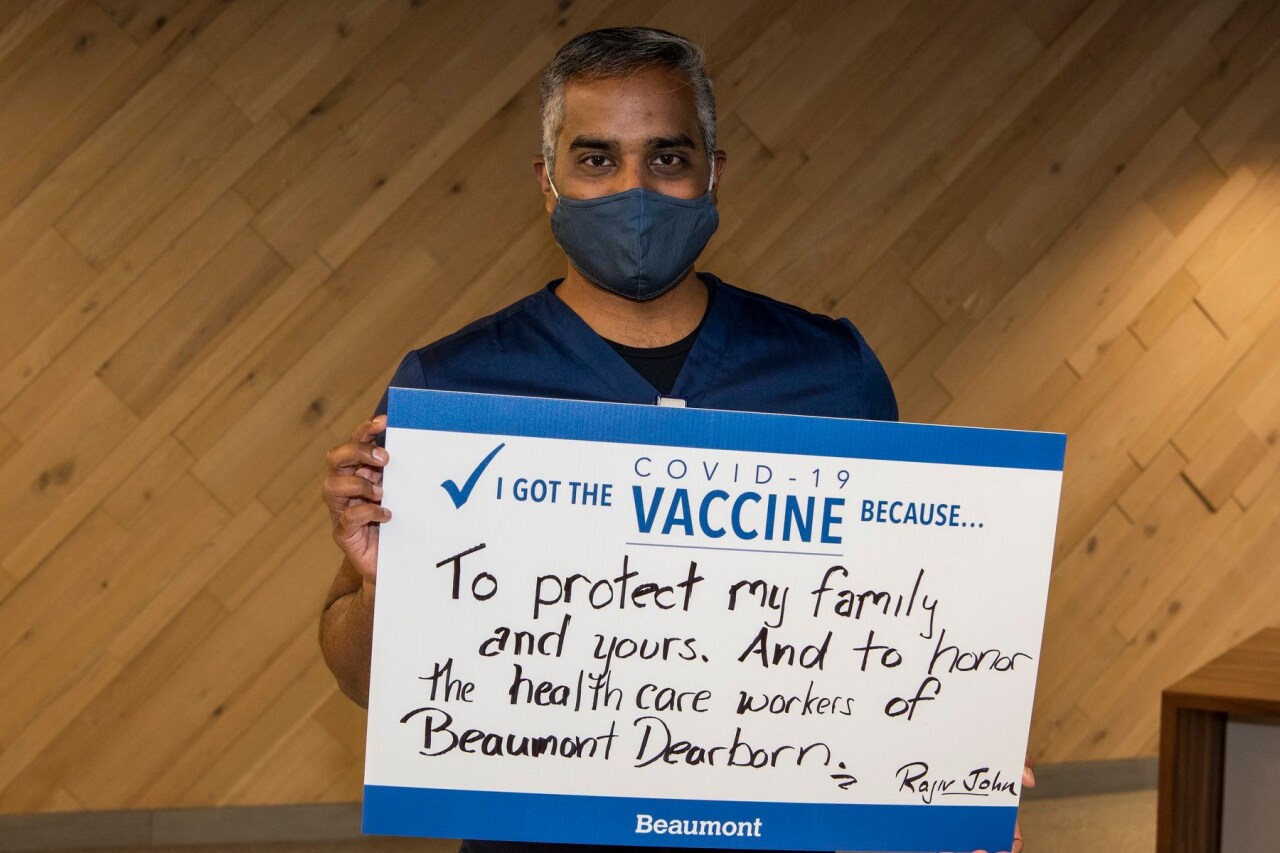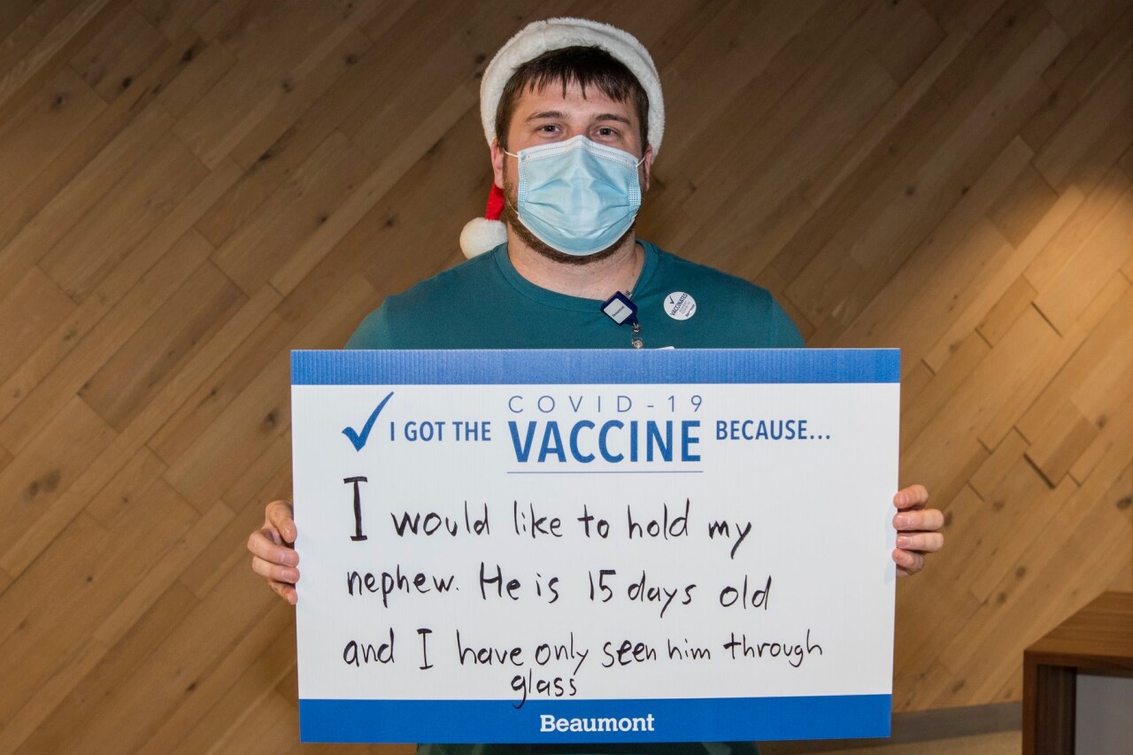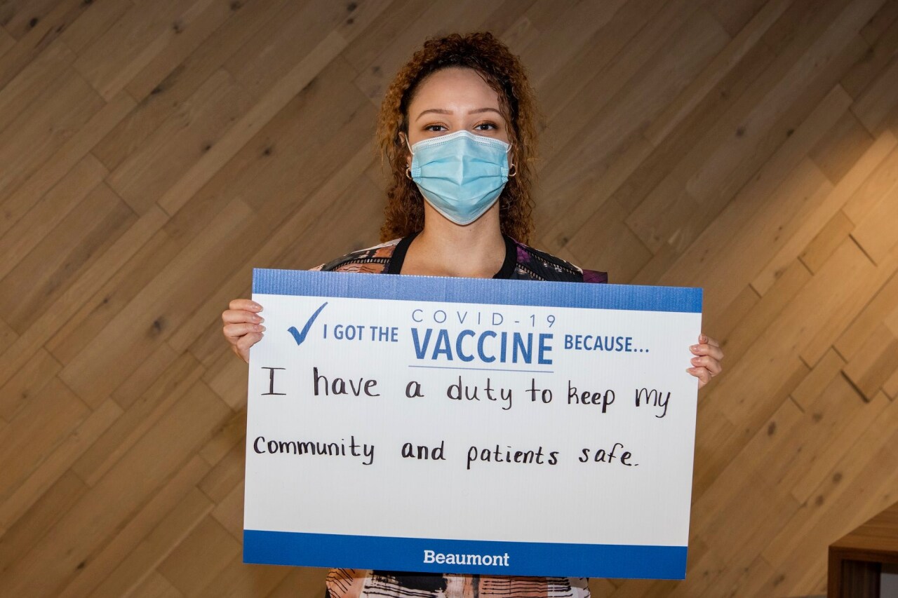 Beaumont Health posted photos to Facebook of their staff holding up signs that read, "I got the COVID-19 vaccine because . . ." with their answers written below.