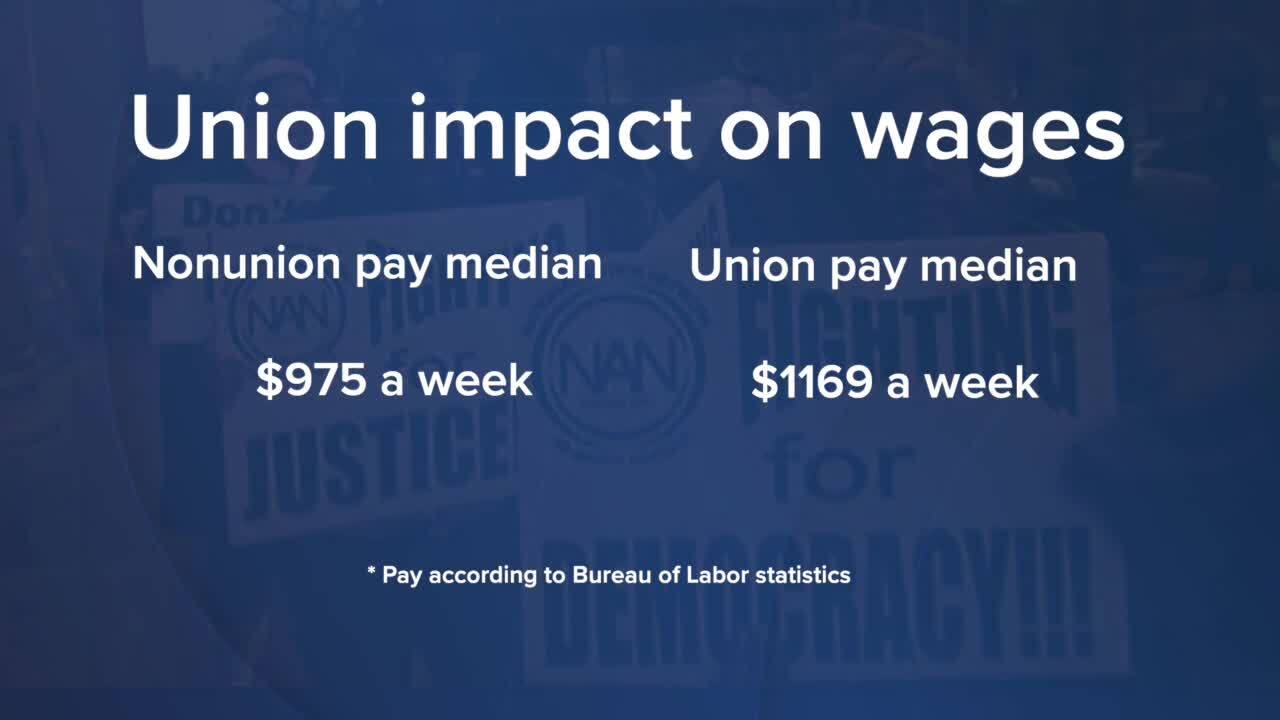The Bureau of Labor Statistics says non union workers in 2021 earned a median weekly pay of $975. 83% of the $1169 union workers took home.