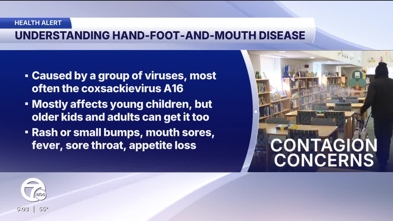 Hand, foot, and mouth disease is a very contagious and common viral illness. It’s caused by a group of viruses, most often the coxsackievirus A16. It mostly affects young children, especially in daycare centers and schools - like what we’re seeing at Pardee Elementary School in Dearborn Heights - but older kids and adults can get it too.