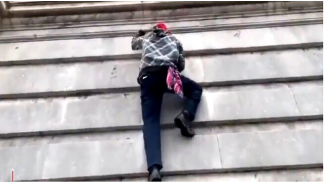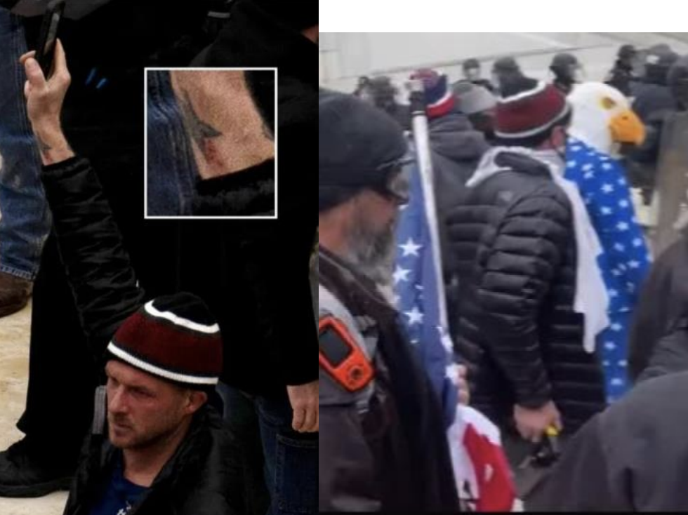 Photos and videos in the federal complaint show Caplinger wearing a Donald Trump hat while climbing a Capitol wall. They also show him inside the Capitol carrying a flag.