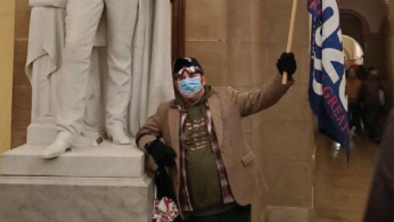 Photos and videos in the federal complaint show Caplinger wearing a Donald Trump hat while climbing a Capitol wall. They also show him inside the Capitol carrying a flag.