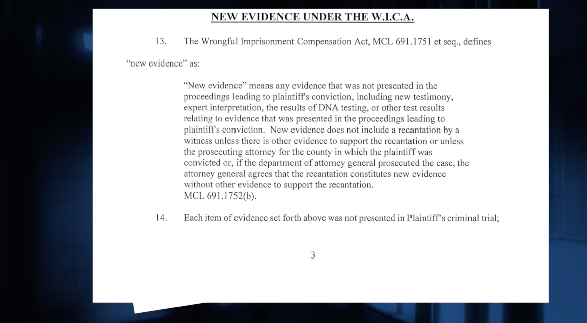 Michigan's Wrongful Imprisonment Compensation Act requires any person seeking compensation to file a lawsuit and demonstrate that new evidence, discovered after their conviction, proves that they had zero involvement in the crime.