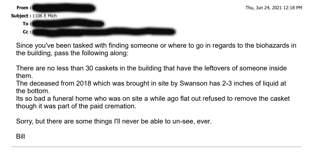 After the initial police raid on June 3, 2021, Michigan’s Department of Licensing and Regulatory Affairs (LARA) issued Cease and Desist orders to Swanson, Tri-County, and to Comfort Cremations.