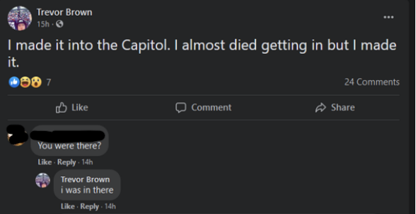 The FBI affidavit said that Brown then posted videos and other posts to social media talking about him participating in the riots, and even getting into the Capitol building.