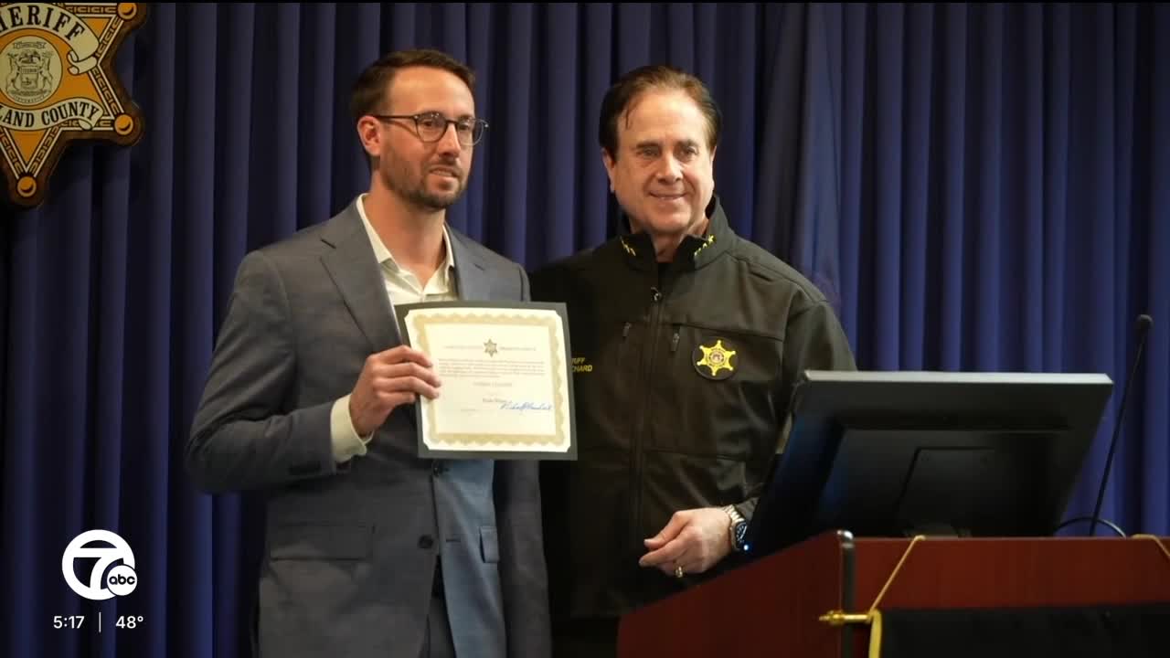 Wade Wines received a life-saving award Thursday from Oakland County Sheriff Michael Bouchard for pulling 36-year-old Adam Brewer from the frigid water after Brewer's snowmobile broke through the ice during safety laps.