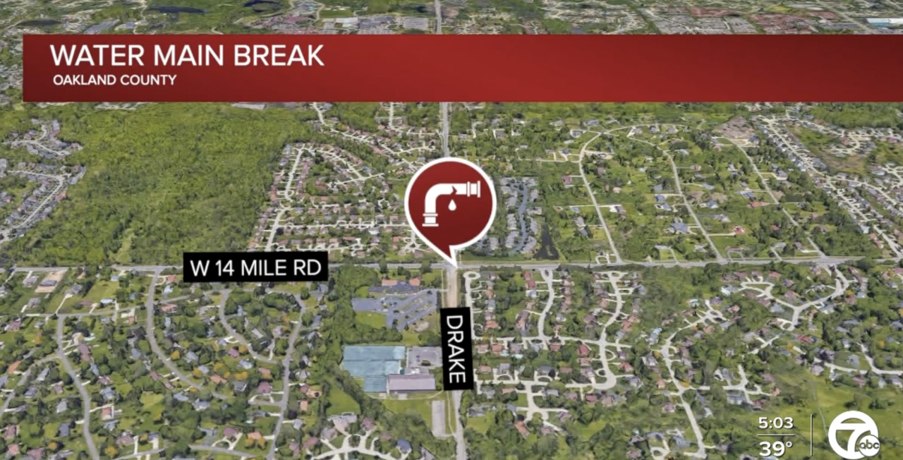 14 Mile Road east of Drake Road is expected to be closed through Thursday due to the water main break.