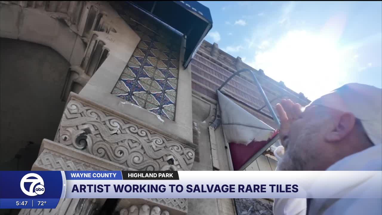 HIGHLAND PARK, Mich. (WXYZ) — Detroit artist Tim Burke is racing against demolition crews to salvage rare, century-old tiles from the Highland Towers Apartments on Woodward Avenue in Highland Park.