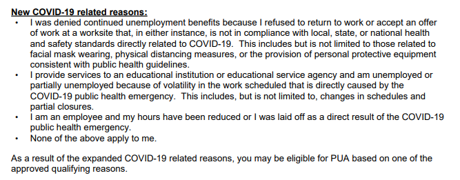 People who received the letter have 20 days to “provide a new self-attestation of your PUA eligibility. You must resubmit your self-attestation based on the updated list of PUA COVID-19 related eligibility reasons for UIA to determine your eligibility.”
