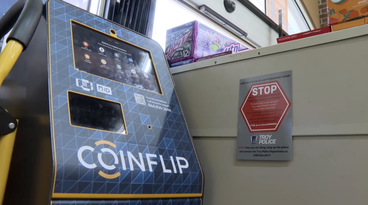 On Tuesday, Hancock and Detective Carlo Pizzorni visited businesses around Troy to place warning fliers near cryptocurrency machines where victims have been tricked into depositing large sums of money.