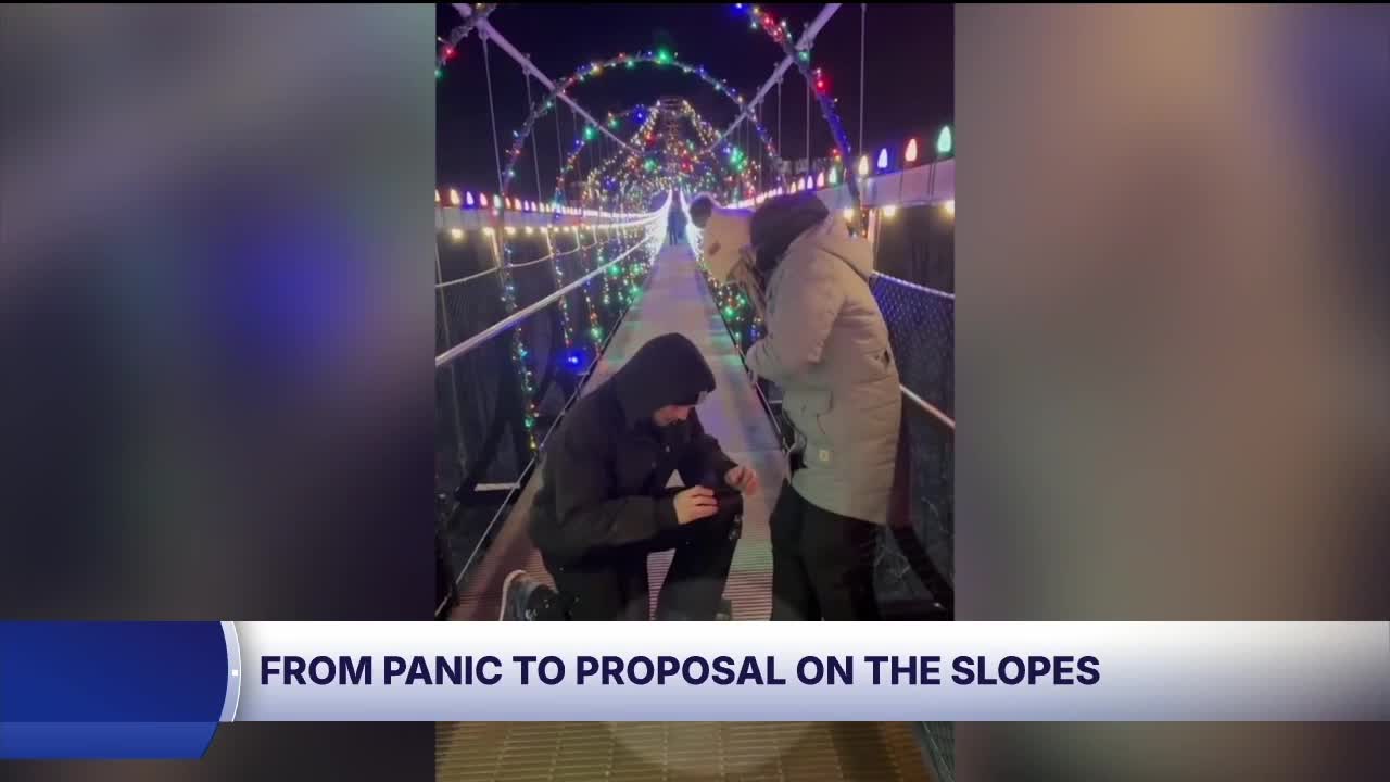 ROCHESTER HILLS, Mich. (WXYZ) — A Rochester Hills man who got engaged on Skybridge Michigan at Boyne nearly had the proposal ruined when the ring slipped through his fingers and through the grate, falling 118 feet to the snow below.