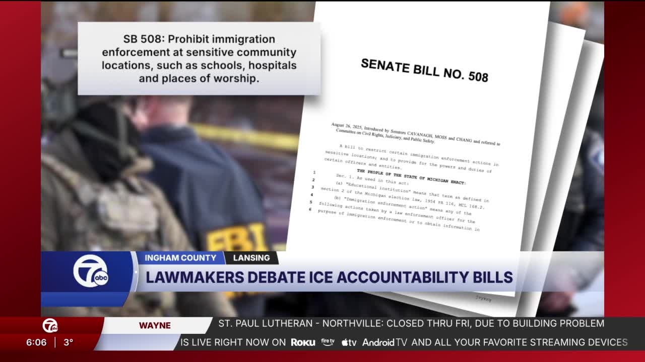 We've already seen calls for action throughout Michigan. The main demand in Lansing is accountability for ICE. There are three Senate bills that would restrict where ICE enforcement can take place, prohibit disclosing certain records to ICE without a warrant, and ban law enforcement officers from wearing masks during operations. Testimony was heard by the Senate Judiciary Committee on Thursday on the package.