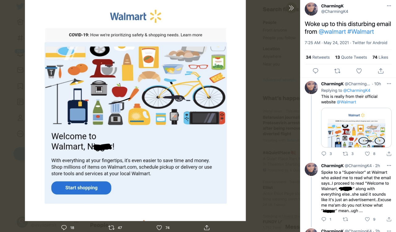 The ad says "Welcome to Walmart, N––" in the subject line and body of the email.