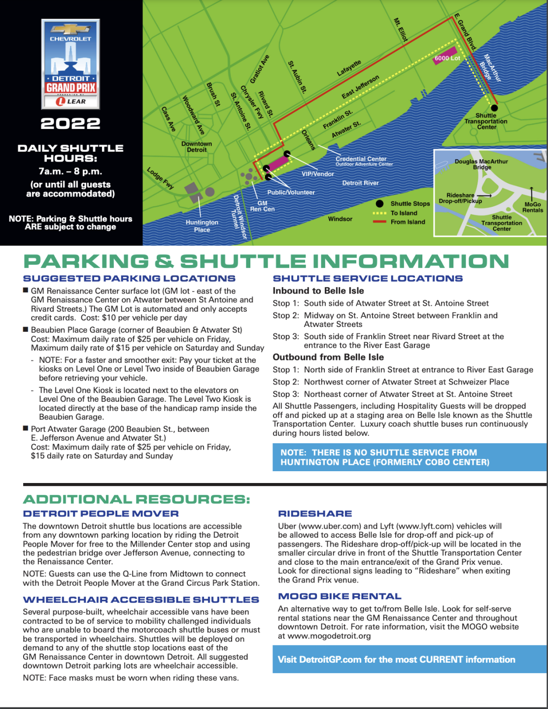 Guests are encouraged to use the complimentary shuttle bus system to get to and from Belle Isle. Shuttles begin running at 7 a.m. each day until 2 hours following the race.