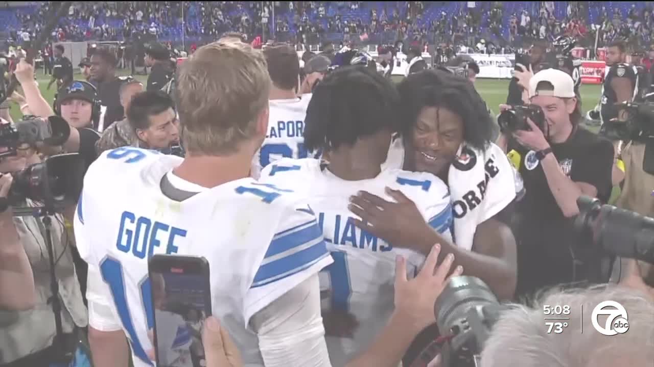 Detroit Lions celebrate Monday Night Football win over Baltimore Ravens