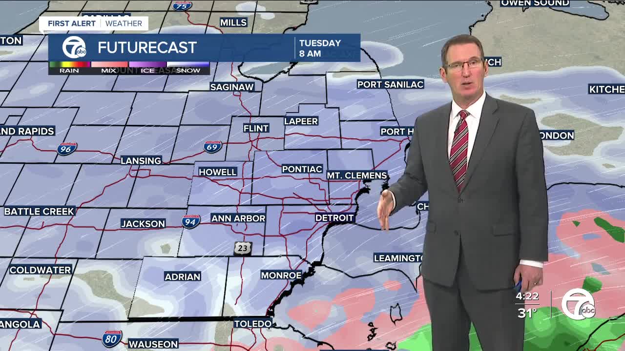 Tonight: Snow moves in from the southwest after 10 pm, some areas northeast may not see snow until after midnight. 2 to 4 inches are expected in most areas. Freezing rain may mix with snow in Monroe and Lenawee counties overnight, which could limit snow totals and lead to more icy roads. Winds will pick up too, leading to low visibility at times. Low of 27°. Wind: NE 10-20 mph.