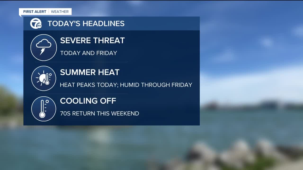 Thursday: Hot and steamy with a storm chance this afternoon. Some may be strong to severe with hail and damaging wind gusts. High of 92 with heat indices in the mid 90s. Winds: SW 10-25 mph.