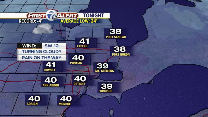 Monday: Mild with a high of 52°. Slight chance of rain.