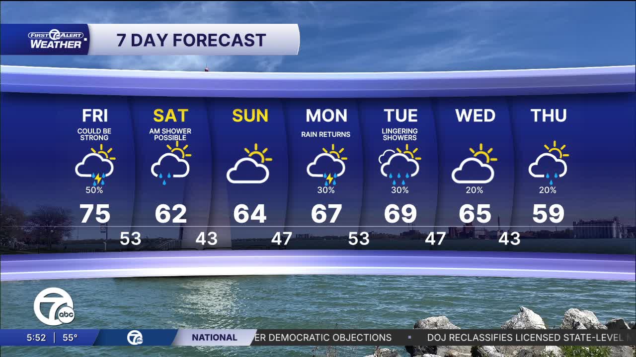 Once the storms move through, tonight turns much quieter and cooler. Skies gradually clear with temperatures dropping back into the upper 40s to low 50s by Saturday morning. Detroit should settle near 53, Pontiac around 51, and some northern suburbs could dip into the upper 40s. A light easterly breeze adds to the cooler feel overnight.