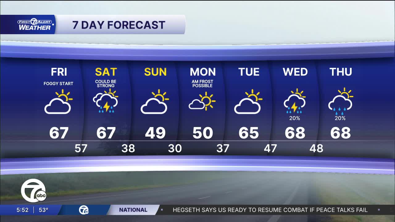 Looking ahead, cooler air settles in for the end of the weekend with highs near 50 on Sunday. Monday morning starts chilly, and we could even see some patchy frost in outlying areas. After that, temperatures rebound nicely into the mid to upper 60s by midweek, with another chance of showers—and possibly a few thunderstorms—arriving Wednesday into Thursday.