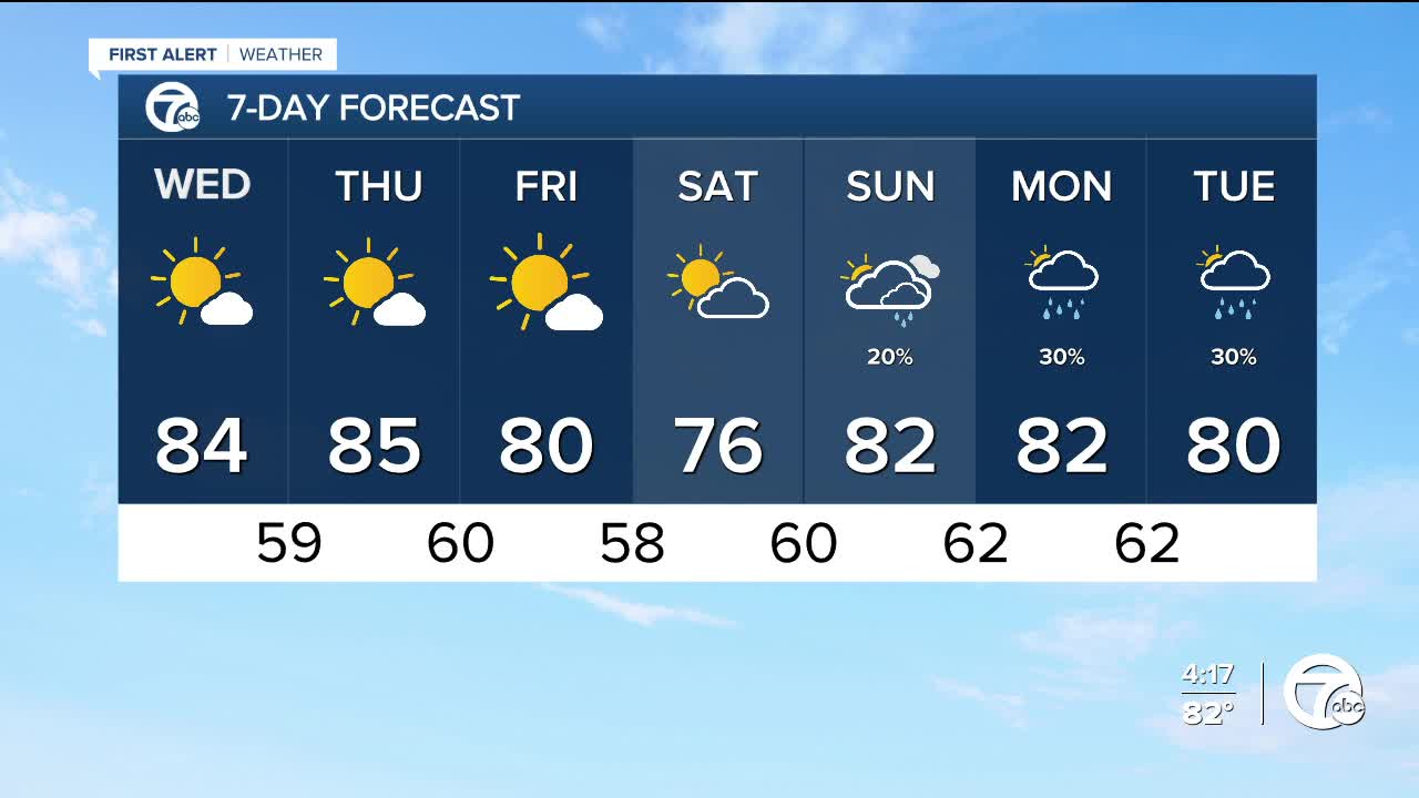 A few areas of fog are possible again Wednesday morning, otherwise skies will be mostly sunny across Metro Detroit. Temperatures continue to climb with highs peaking in the low to mid 80s.