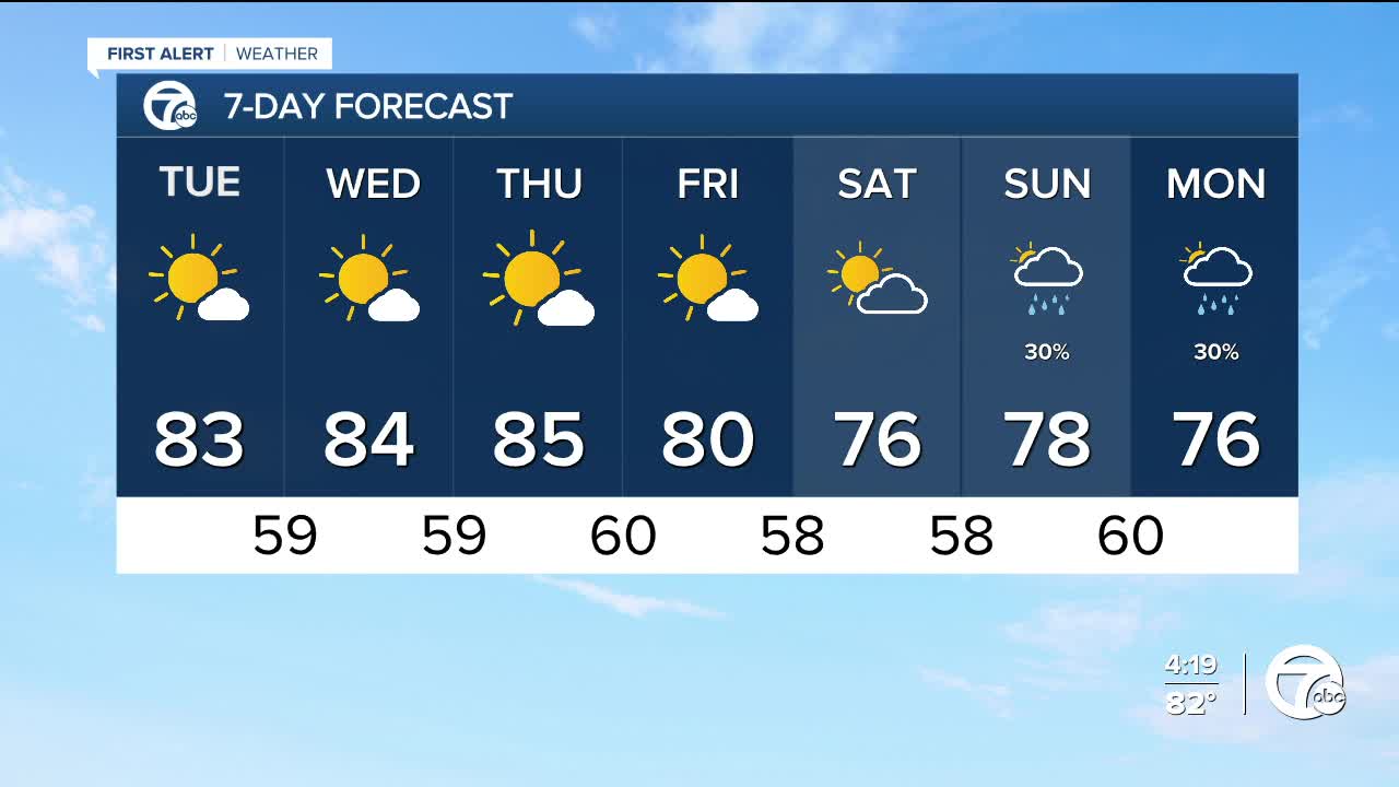 High pressure will continue to bring mostly sunny skies and warmer temperatures across Metro Detroit this week. Highs will be in the low to mid 80s each day, nearly 10° above average.