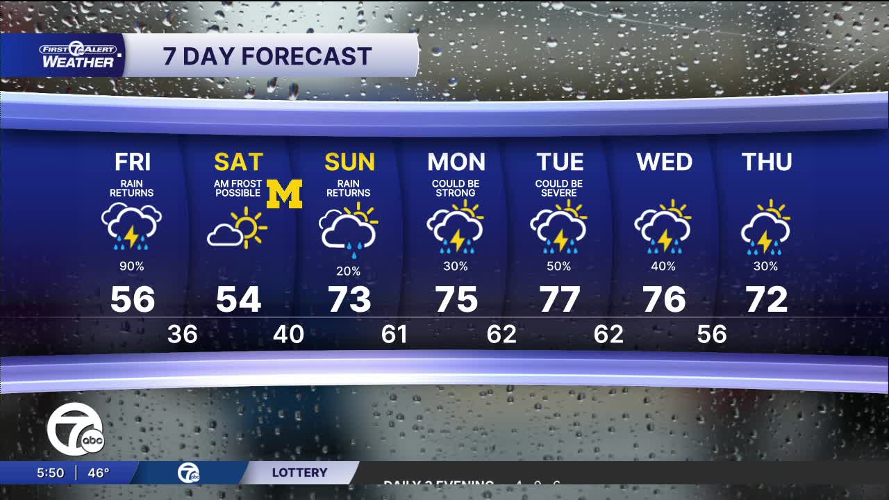 Tonight, skies begin to clear and that will allow temperatures to drop quickly into the low-to-mid 30s across much of Metro Detroit, with patchy frost possible by early Saturday morning—especially in the colder inland spots like Ann Arbor, Howell, Pontiac, and Lapeer. Wear extra layers for the Michigan Basketball Championship parade.