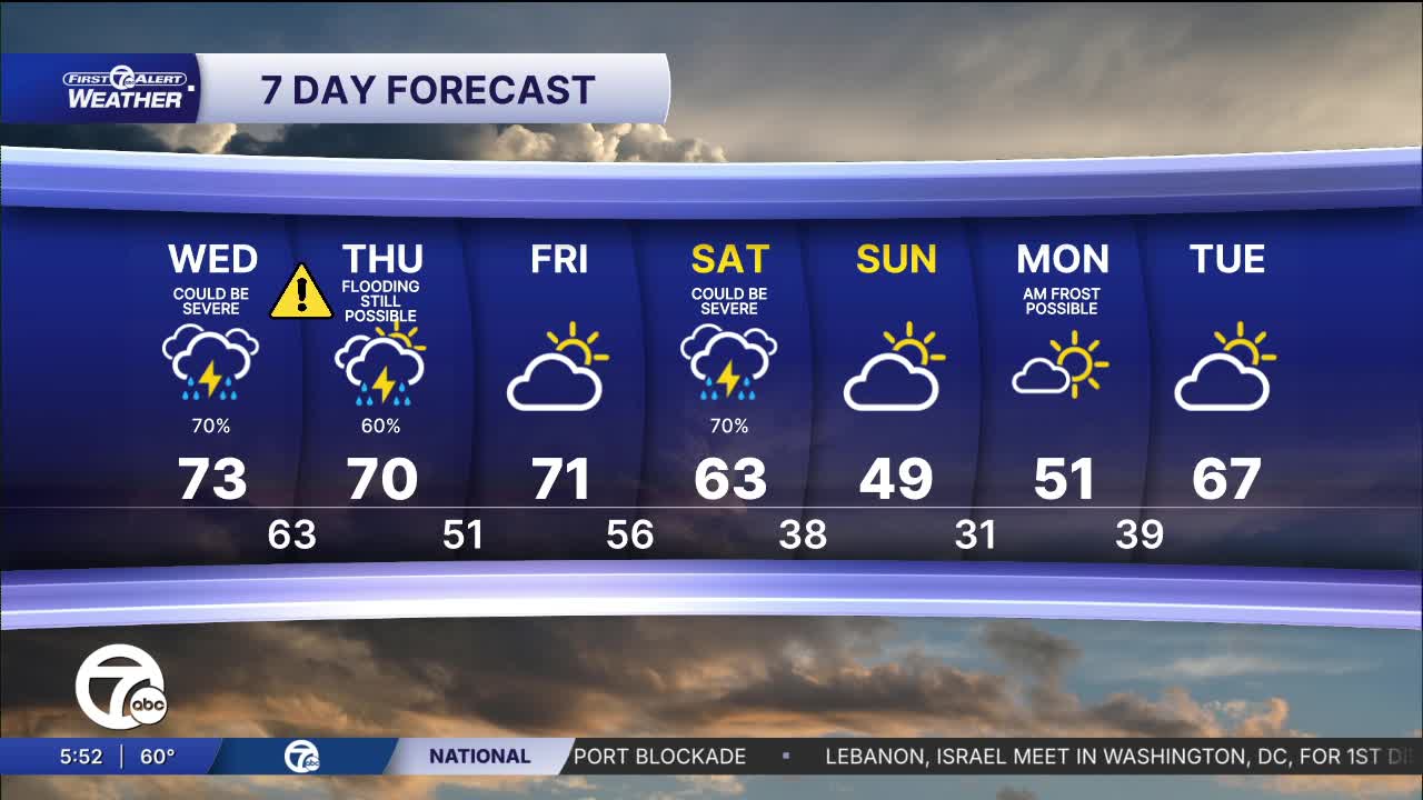 Today: More storms are likely and a few could be severe. More rain will increase the flood chance. Highs in the low to mid 70s. Winds: SW 10-20 mph.