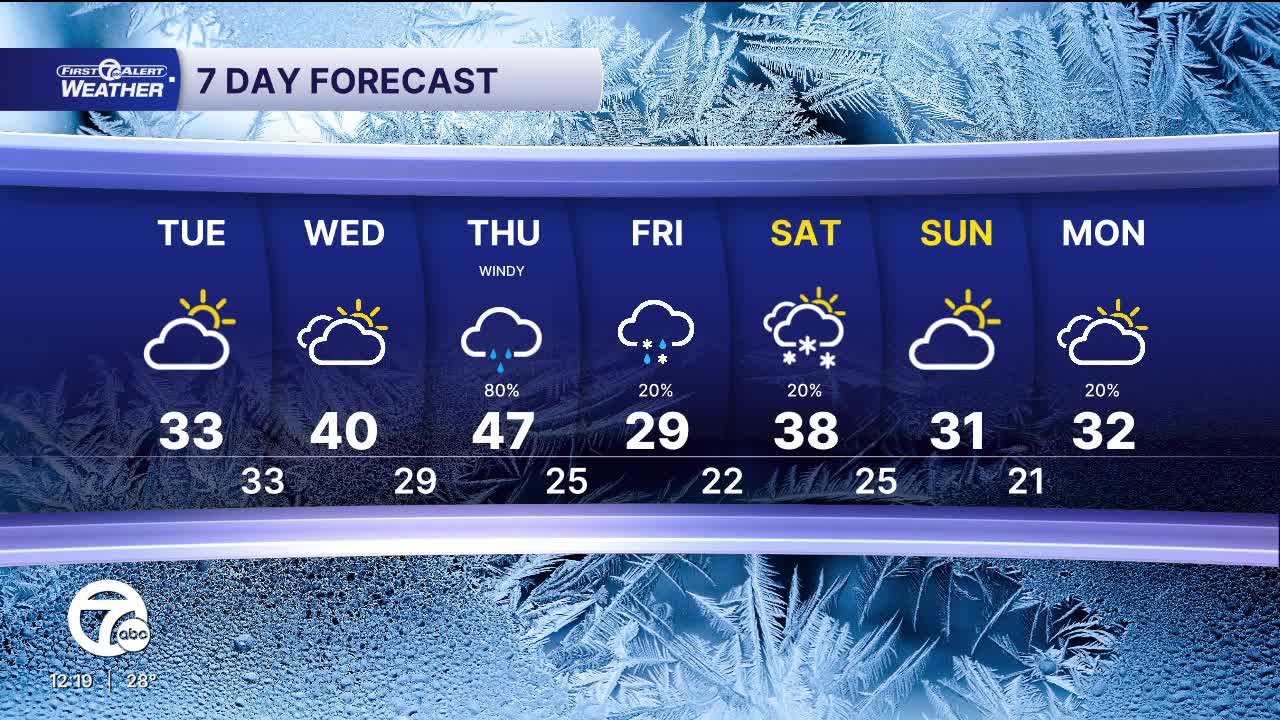 Thursday is the standout day in the stretch for Metro Detroit, bringing milder temperatures and widespread rain. We’ll start the day on the cool side, but southerly flow helps temperatures climb steadily into the mid to upper 40s by the early afternoon. Skies stay mostly cloudy as periods of rain develop as the day goes on. Rain will be heaviest during the late afternoon and evening.