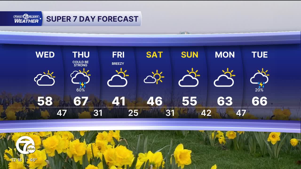 Thursday: Mostly cloudy with rain chances increasing in the afternoon. Storms are possible as well late in the day and through the evening. An isolated storm could become severe. Highs will be in the mid to upper 60s with 67° in Detroit. Winds: SW 10-20 mph.