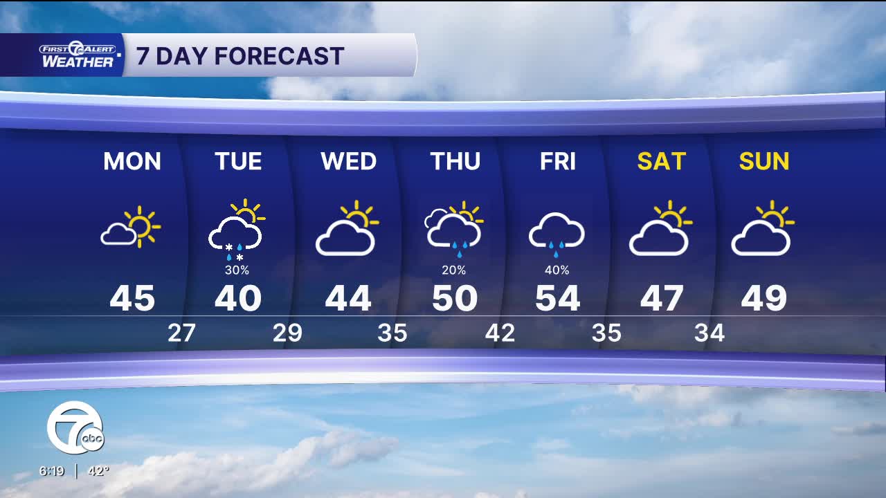 Chillier temperatures stick around to start the workweek with morning lows in the 20s and highs in the 40s through Wednesday. Monday will still be a bit breezy with mostly sunny skies. Highs peak near 45°.