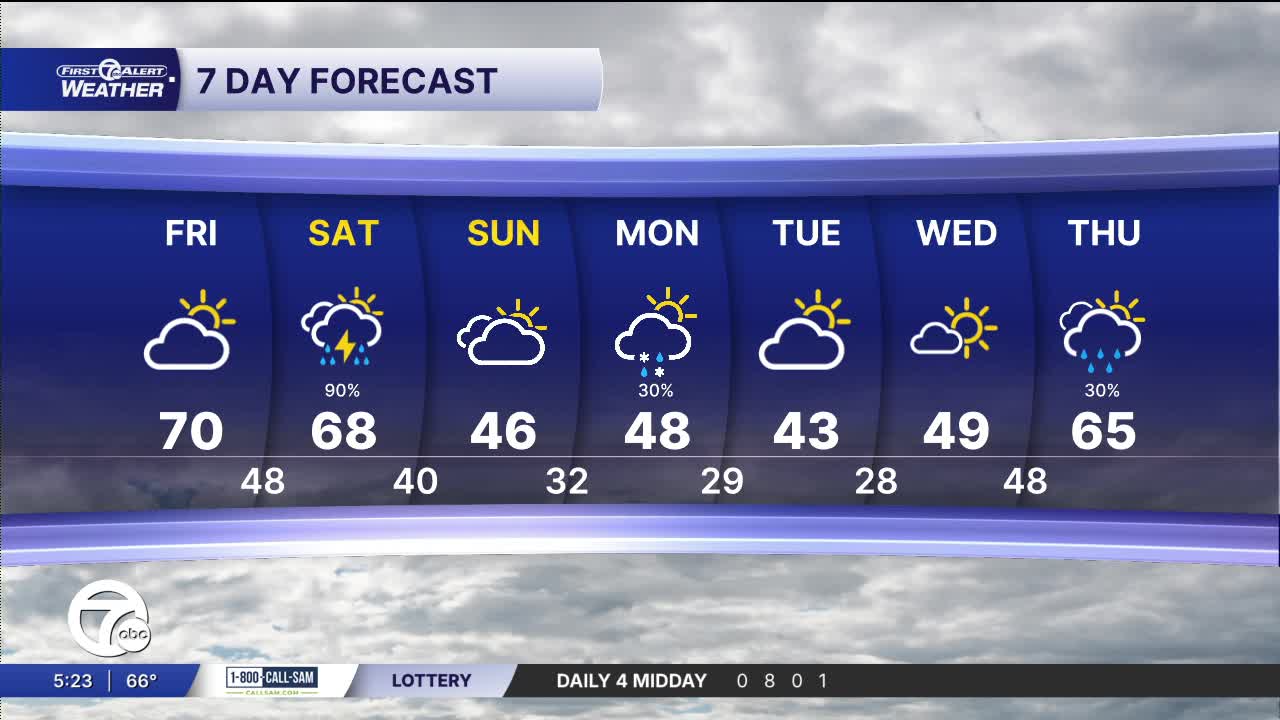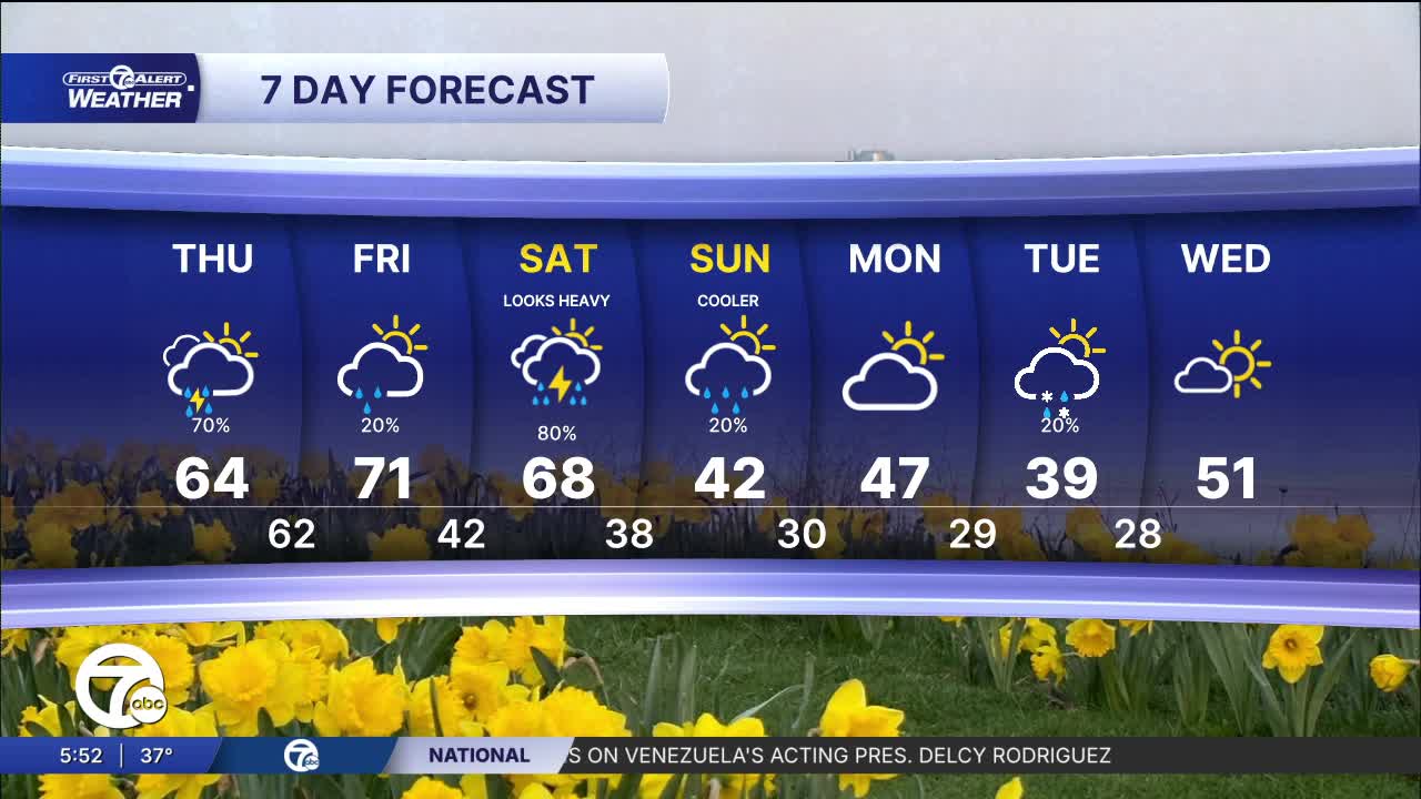 It’s a damp start with morning rain likely and some storms with heavy rain possible. The rain ends early afternoon. Temperatures climb into the 50s but some will climb into the 60s by evening. Those warmest areas will be around Detroit and to the southwest. There is a threat for high winds, hail, and a tornado possible Thursday evening and night.