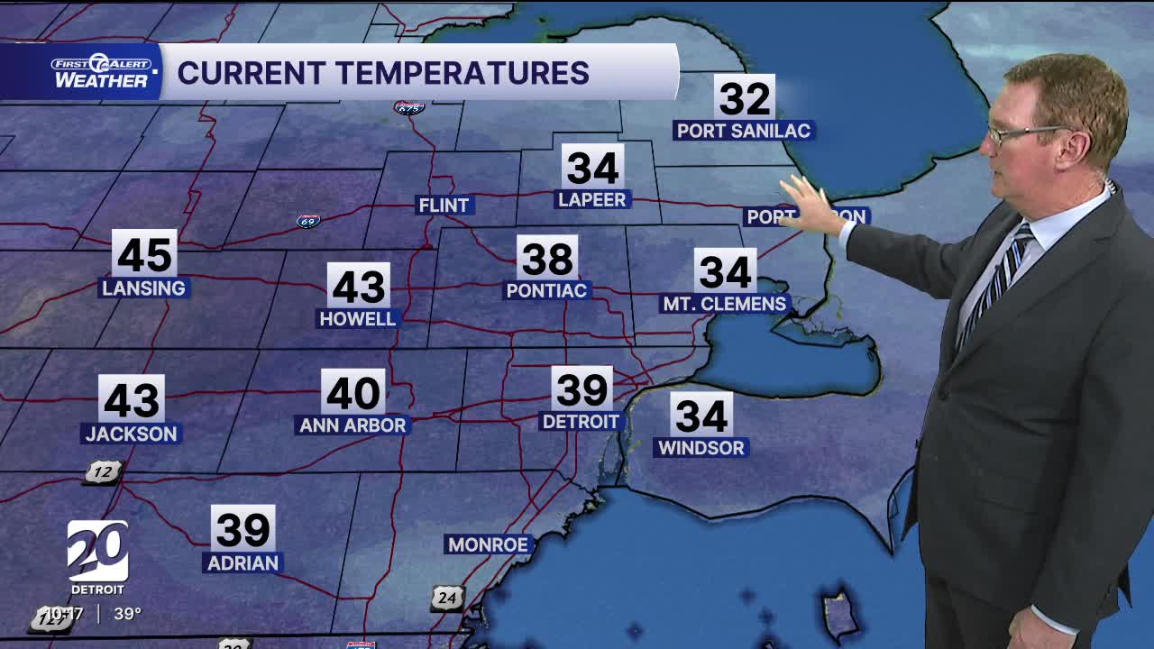Today: Mostly cloudy with highs in the mid 40s, with 48° in Detroit. Winds: S 5-15 mph.
