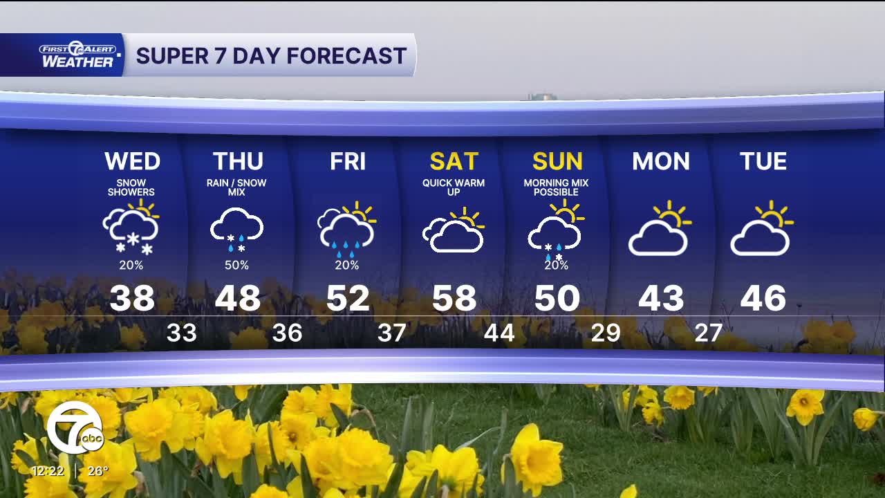 Thursday: Mostly cloudy with a chance of showers. It will be more rain than snow. Highs will push back to the mid to upper 40s with 48° in Detroit. Winds: WSW 5-10 mph.