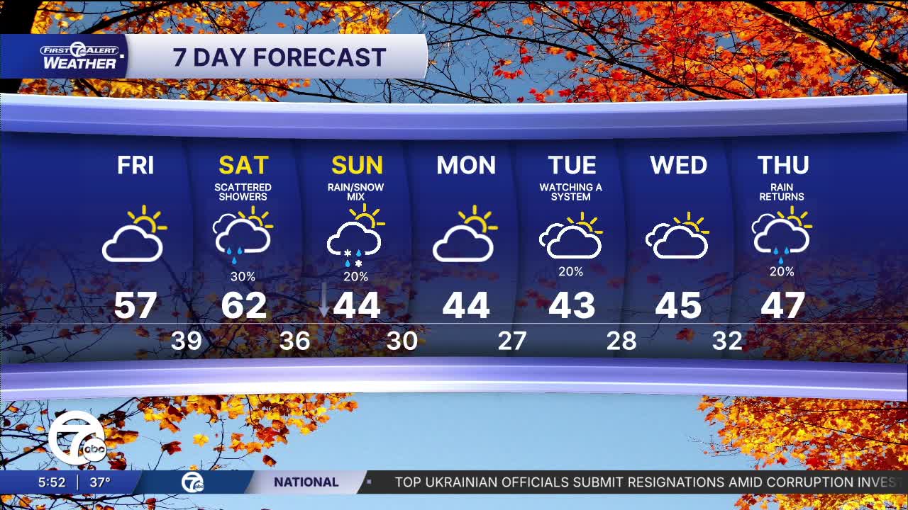 Friday: We will finish the week with a few clouds around in the morning and then decent sun in the afternoon. High temperatures will reach the low to mid 50s and 54° in Detroit. Winds: S 5 mph.