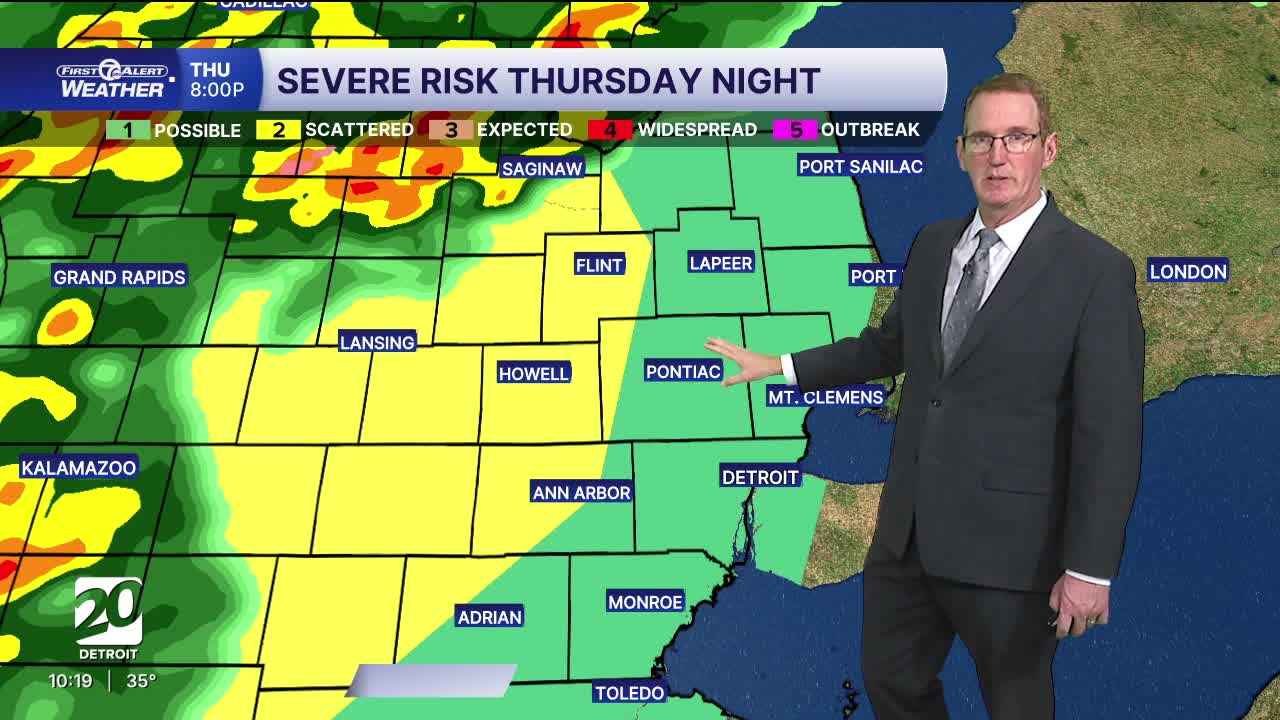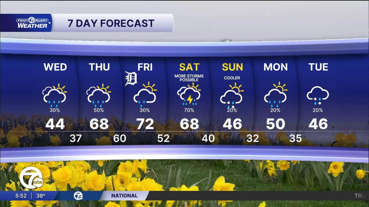 Today: Mostly cloudy with rain possible south of I-94. A little late day sun will happen north of Detroit. Highs in the low to mid 40s around Metro Detroit with a NNE wind at 10-15 mph.
