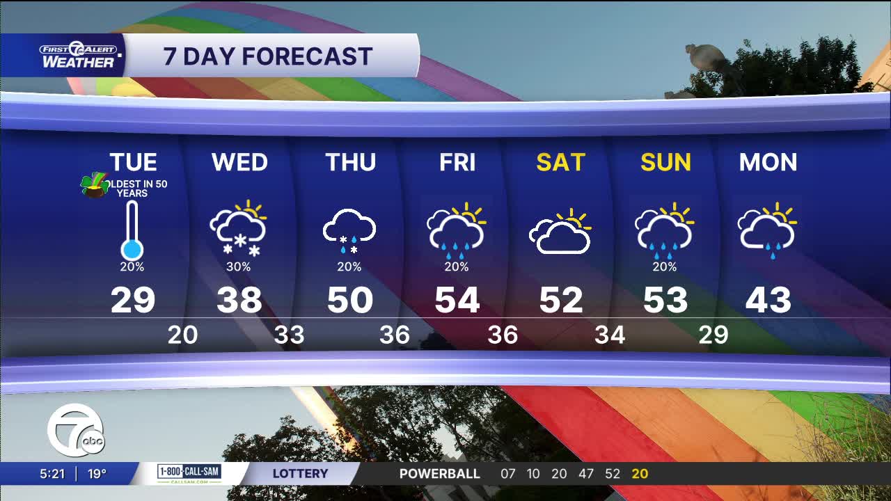 Tuesday: Mostly to partly cloudy. There will be a slight snow shower chance. Highs in the upper 20s. Winds: S 10-20 mph.