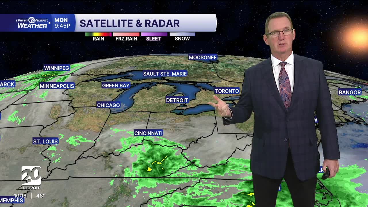 A storm system will push in clouds starting late Wednesday before rain moves in that night and Thursday. The center to the storm will pass to our east, leaving southeast Michigan on the western edge of the storm system. This means rain will likely be heaviest along a line from Port Huron-Detroit-Monroe, with lighter rainfall out towards Pontiac-Howell-Adrian. Showers will continue through the day Thursday with highs in the low 50s.